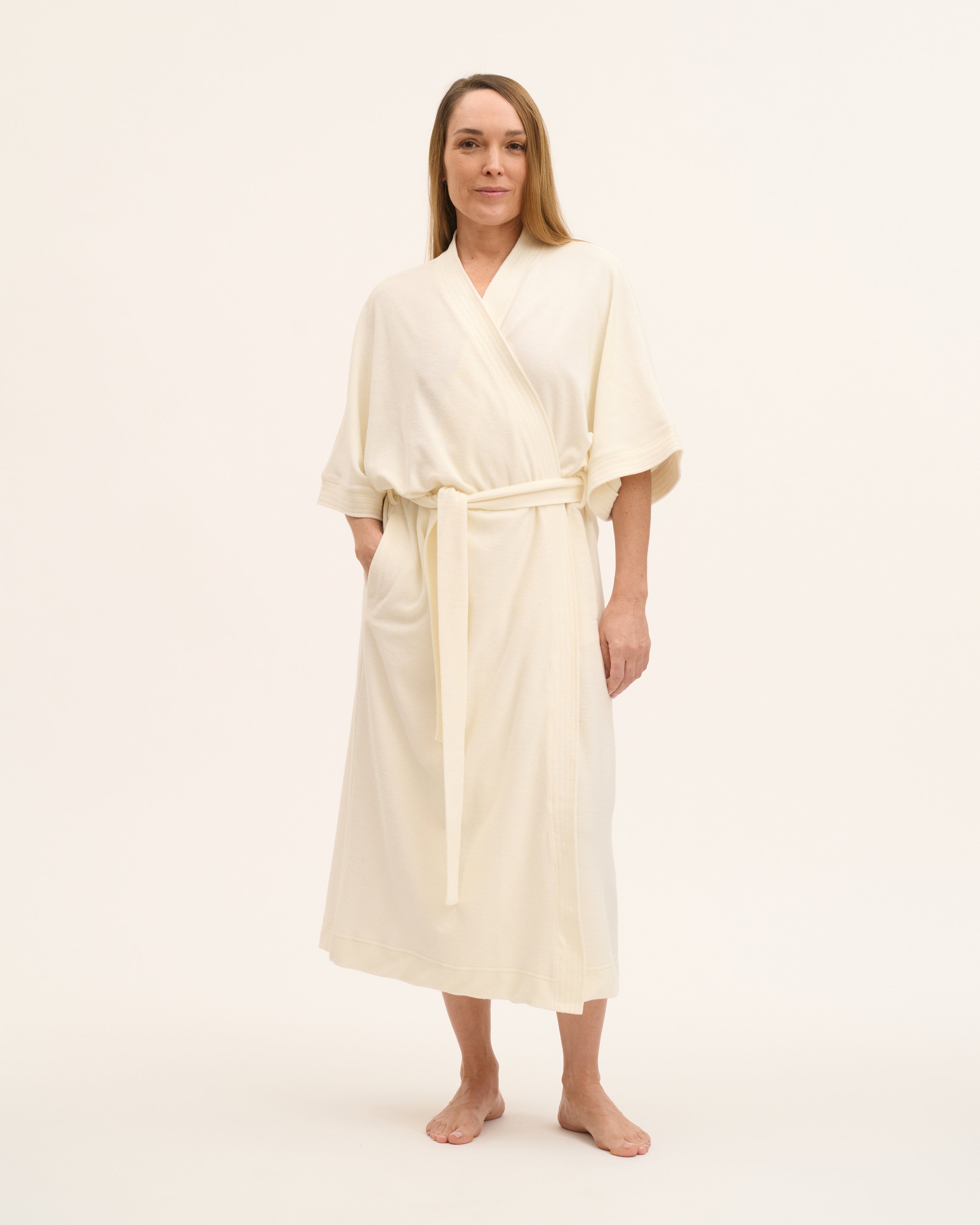 SuperSoft Knit ist ein mikrofeiner Strick aus Italien. Innen weich und saugfähig, außen ruhig und hochwertig im Ausdruck. Der Stoff wärmt, ohne zu beschweren, ist atmungsaktiv und eignet sich ideal für den Übergang von Nacht zu Tag. Ein Material, das Komfort bietet und gleichzeitig wie Daywear wirkt.
